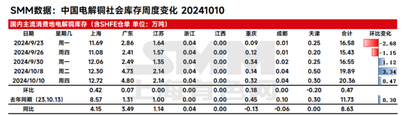 SMM全国主流地区铜库存国庆节后出现累库 重回20万吨上方
