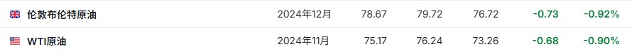 3.截至发稿,WTI原油跌0.90%,报75.17美元/桶。布伦特原油跌0.92%,报78.67美元/桶。