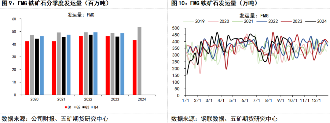 (3)FMG:铁桥项目继续增产。24年前二季度,FMG铁矿石产量(铁矿石加工量)分别为4240/5080万吨,同比分别-8.03%/+5.39%,一季度主要受列车脱轨及飓风影响同比下滑,二季度表现强劲。FMG的铁桥项目(Iron Bridge)在24财年因处理系统问题影响仅发运120万吨,预计系统优化后发运能够显著提升。FMG将未来一年铁桥项目发运目标设定为500-900万吨(100%权益),计划在2025年9月实现满负荷生产。此外,FMG还在继续推进贝林加项目(Belinga)以及皮尔巴拉地区铁矿石的勘探工作。