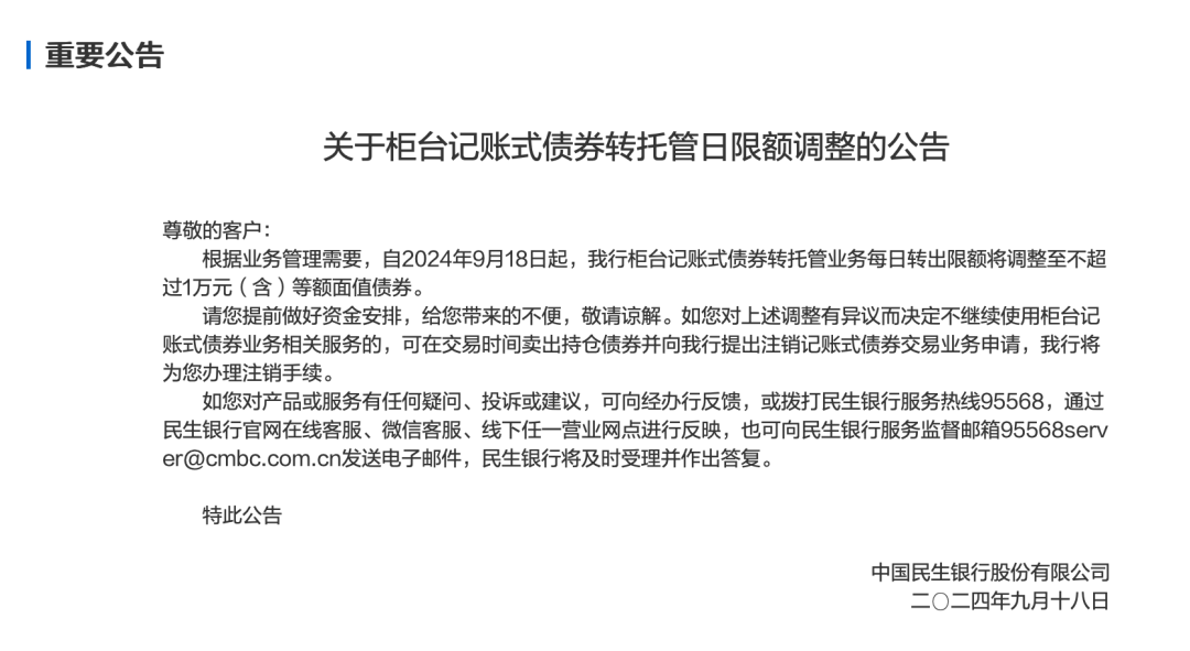 公告显示,根据业务管理需要,自2024年9月18日起,该行柜台记账式债券转托管业务每日转出限额将调整至不超过1万元(含)等额面值债券。