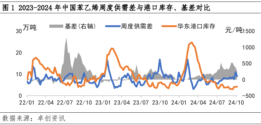 本周苯乙烯供需基本面明显转弱,供需差扩大至将近5个月以来的高位,主要是供应增加、需求减少所致。10月上旬前期大沽检修结束后贡献增量,产量小幅增多;需求端下游基本均有减量,EPS减量最多,受假期行业有集中短停习惯影响;ABS则是有装置产线小幅降负及企业因利润亏损问题停工;PS则因企业库存高位,需求不佳影响,存企业降负及停工情况。本周苯乙烯基差也逐步走弱,一方面主港库存有继续累库预期,另一方面江苏虹威新装置国庆期间投产,或于中旬后逐步销售,因此虽有大装置集中检修,但市场供应尚不紧张,基差逐步走弱。