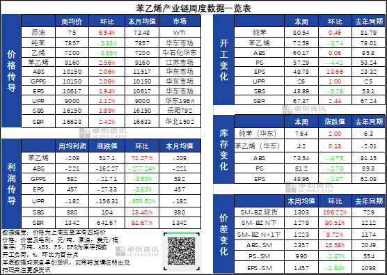 本周苯乙烯产业链均价上游纯苯与乙烯下跌,其他产品上涨为主。尤其原油涨幅最大,产业链集体上涨主要是受原油及股市利好提振。具体产业链上下游表现如何,后续走势又该何去何从?本文将根据亮点数据为您一一解读。