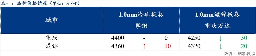 重庆、上海地区冷轧板卷区域价差维持不变;重庆、广州冷轧板卷区域价差缩小30元/吨。重庆、上海镀锌板卷区域价差维持不变;重庆、广州镀锌板卷区域价差缩小20元/吨。镀锌、冷轧品种价差反向扩大30元/吨;镀锌、热轧品种价差缩小50元/吨;冷轧、热轧品种价差缩小20元/吨。