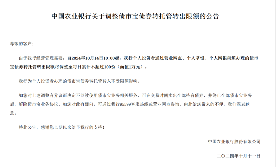 10月11日,农业银行发布公告称,由于经营管理需要,自10月14日10:00起,农业银行个人投资者通过营业网点、个人掌银、个人网银渠道办理的债市宝债券转托管转出限额将调整至每日累计不超过100份(面值1万元)。