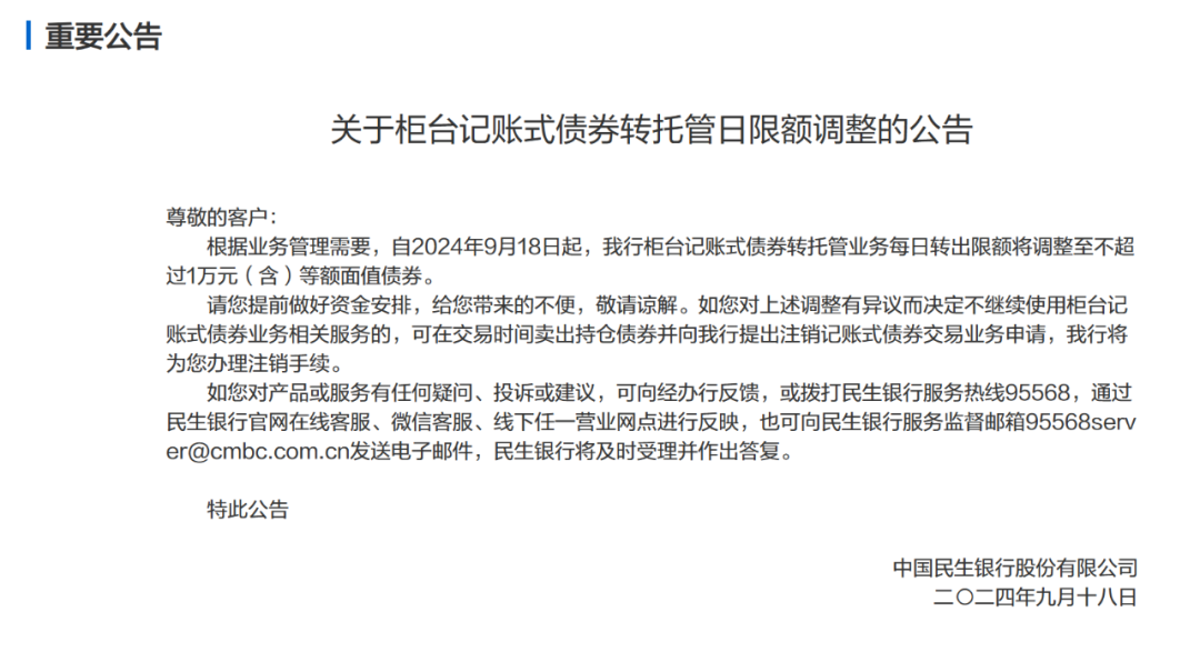 不仅仅是农业银行,此前民生银行也发布公告称,根据业务管理需要,自9月18日起,该行柜台记账式债券转托管业务每日转出限额将调整至不超过1万元(含)等额面值债券。请客户提前做好资金安排。