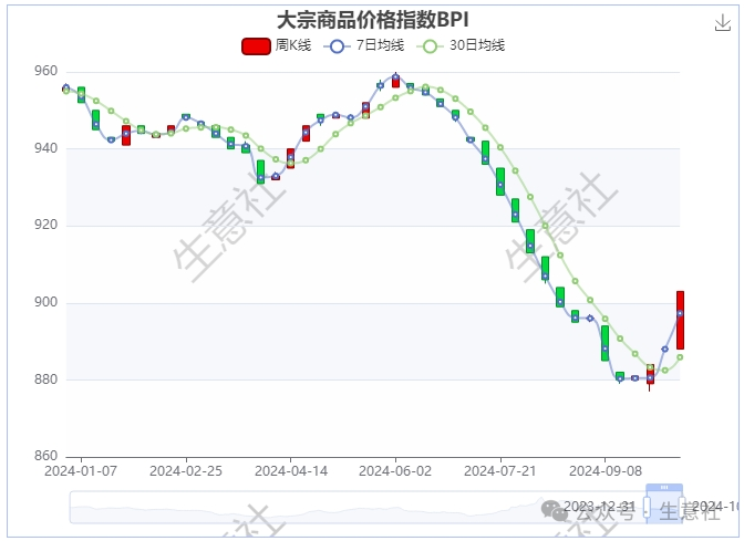 10月12日大宗商品价格指数BPI为903点,较周初上升了15点,较周期内最高点1343点(2021-10-19)下降了32.76%,较年内最低点877点(2024-09-24)上涨了2.96%。