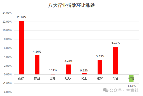 个行业,本周涨多跌少,上涨前三的分别是钢铁行业,涨幅为2.37%,橡塑行业,涨幅为2.13%,能源行业,涨幅为1.67%;下跌的是农副行业,跌幅为-0.10%。
