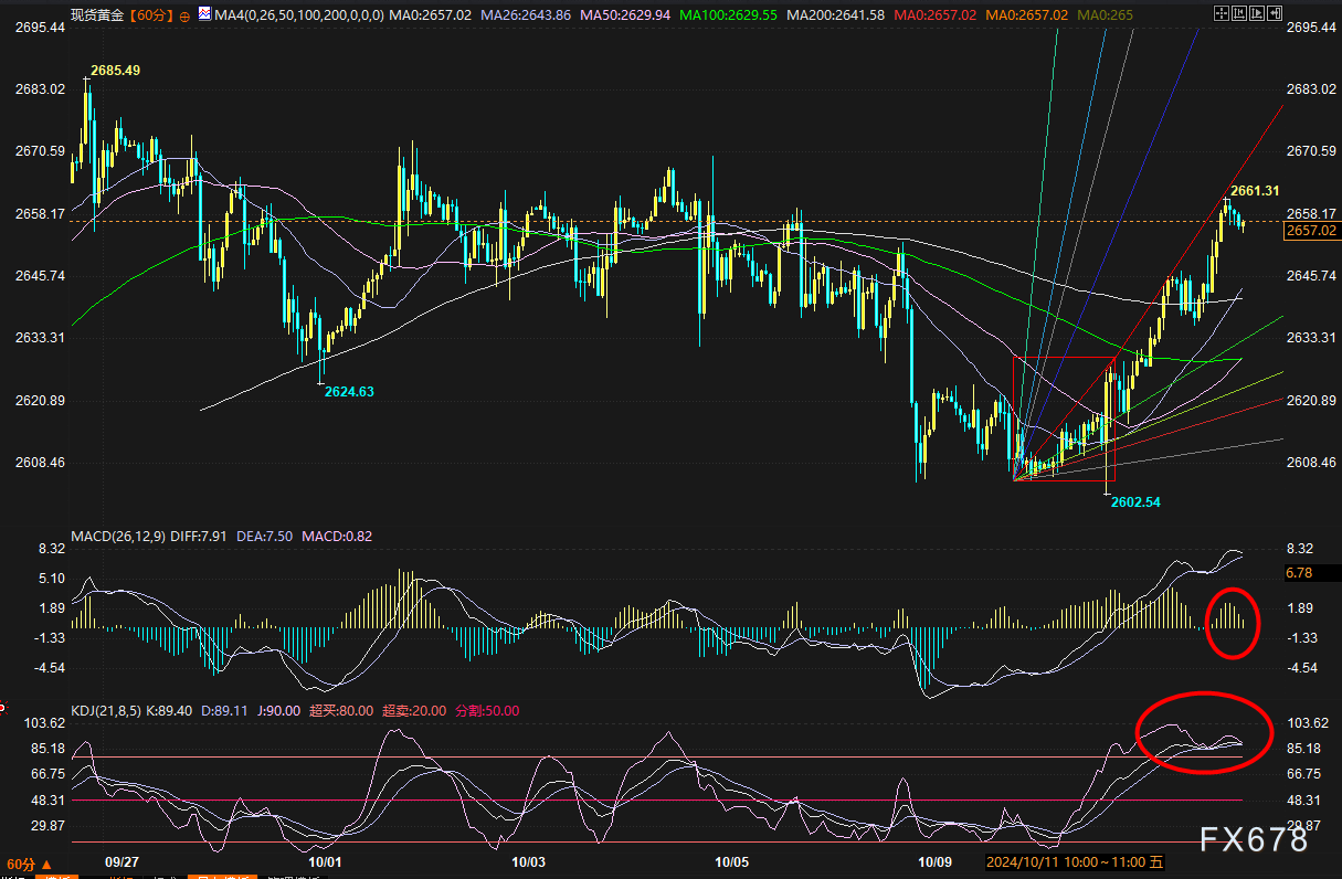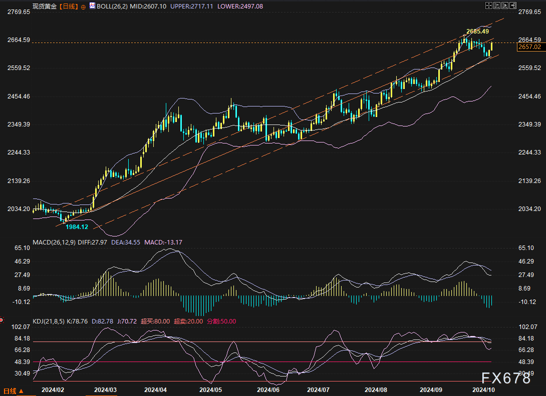 汇通财经APP讯——上周(1007-1011当周),金价以先跌后涨的类V型形态完成一周行情,周线微收涨0.17%至2657.02美元/盎司。虽然收涨幅度微弱,但长脚阳线依然是一个偏于积极的信号。金价以V型反转之后将涨到哪里,会被打回原形还是继续上攻测试2700?这是本周黄金行情的一个关键问题。