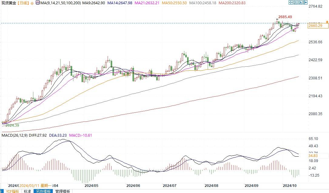 北京时间10月14日13:20,现货黄金报2660.00美元/盎司