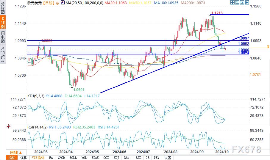 欧元/美元继续向上周的低点1.0900下滑,该低点下方是8月8日的低点1.0882和200日简单移动均线(SMA)1.0874。