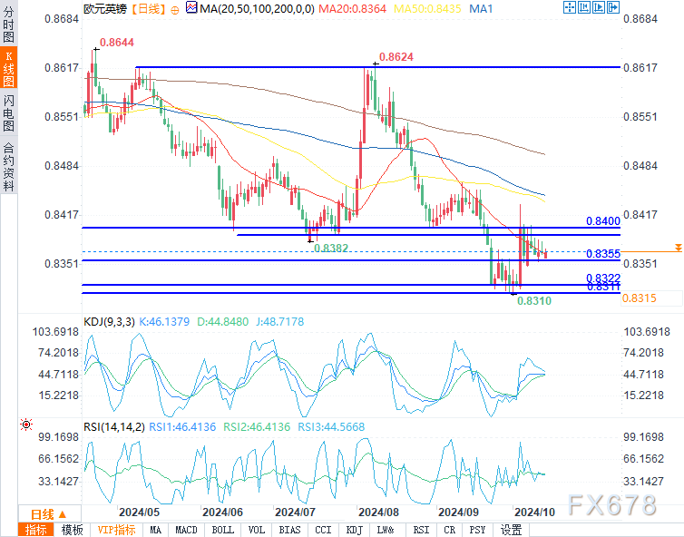 欧元/英镑仍处于压力之下,并向上周低点0.8355回落。在该水平下方是0.8322至0.8311的支撑区域。