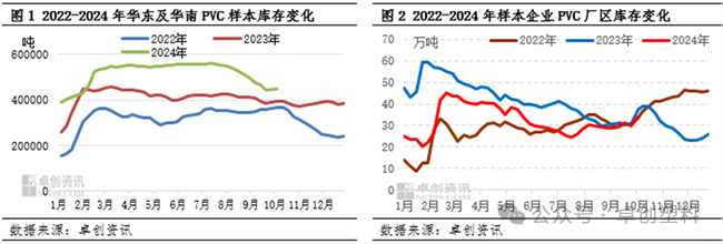 整体来看,目前PVC库存仍历史同比高位,供应压力较高。今年国庆节后从样本库存的增量变化来看要低于往年,尽管有一些货源分流现象,但同时说明高库存问题并未出现进一步恶化的局面。