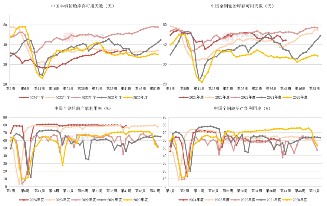 截至10月11日,中国半钢轮胎周度产能利用率环比增加。库存可用天数环比下降。