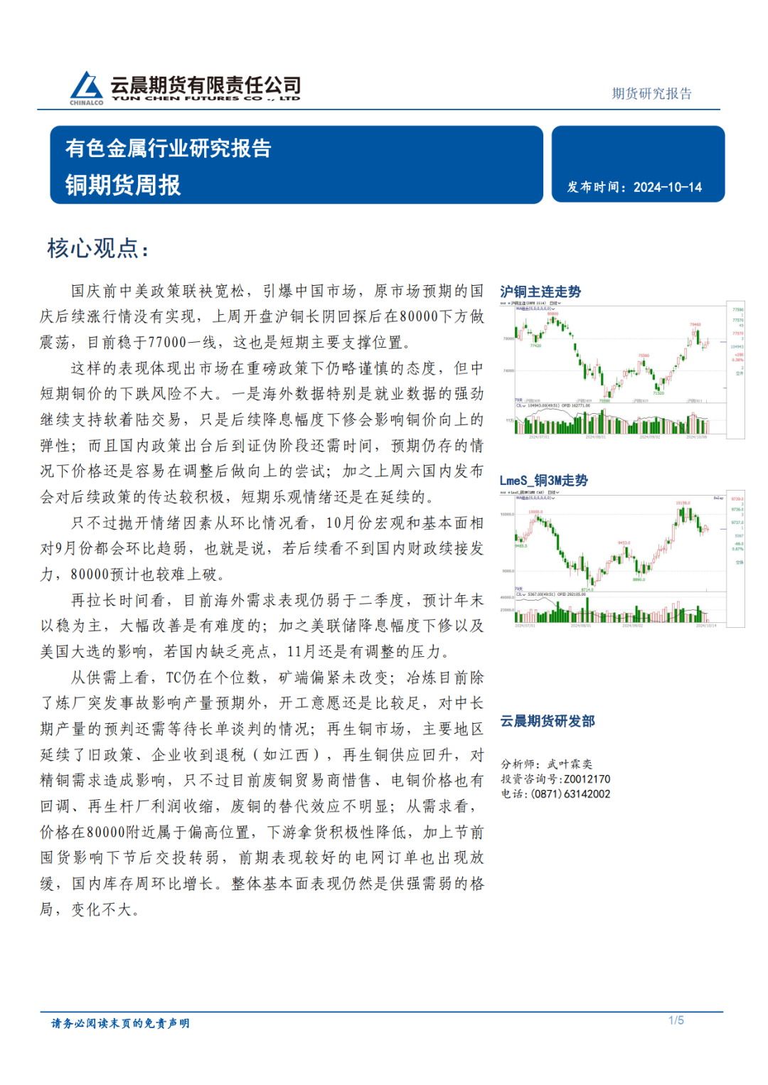 国庆前中美政策联袂宽松,引爆中国市场,原市场预期的国庆后续涨行情没有实现,上周开盘沪铜长阴回探后在80000下方做震荡,目前稳于77000一线,这也是短期主要支撑位置。