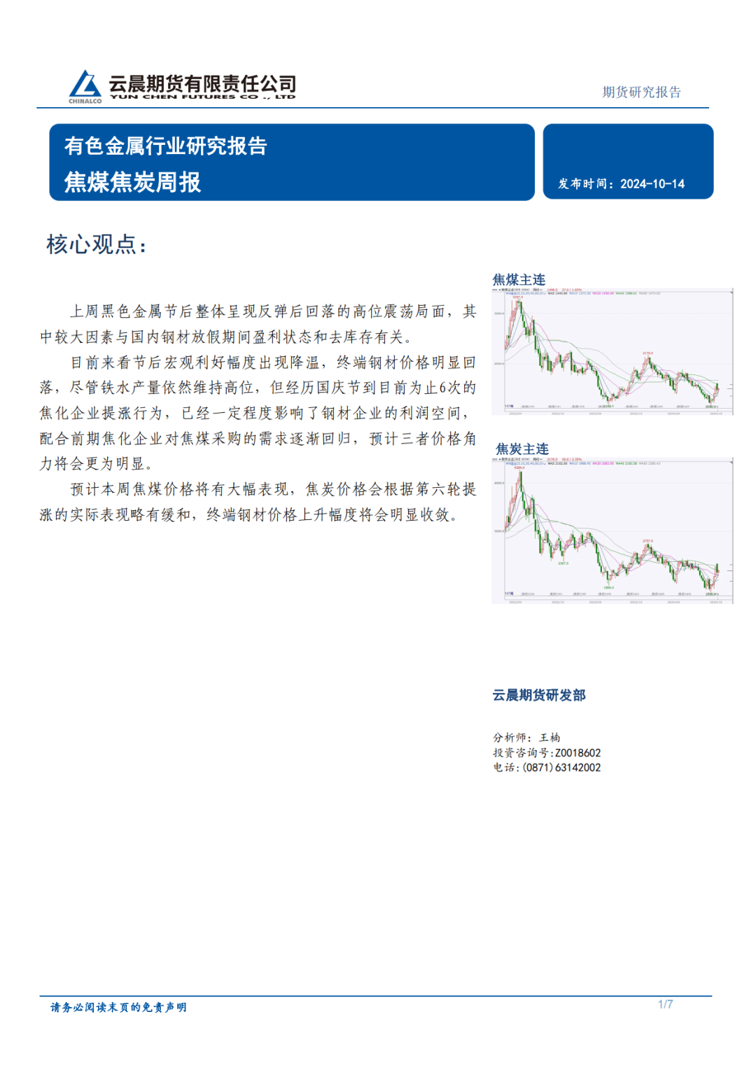 预计本周焦煤价格将有大幅表现,焦炭价格会根据第六轮提涨的实际表现略有缓和,终端钢材价格上升幅度将会明显收敛。