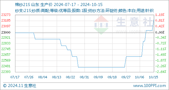 10月15日生意社棉纱21S基准价为23033.33元/吨