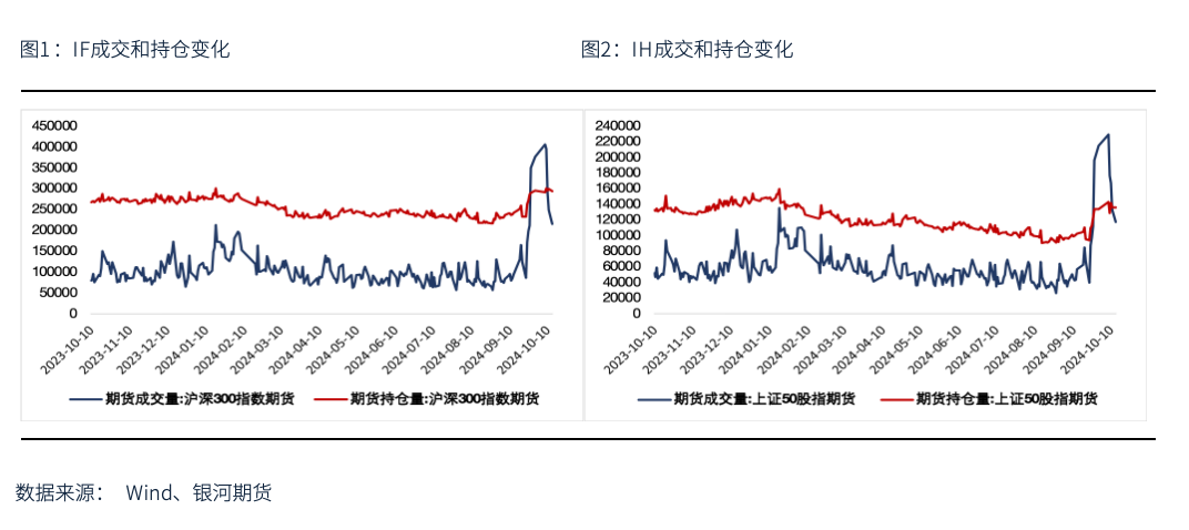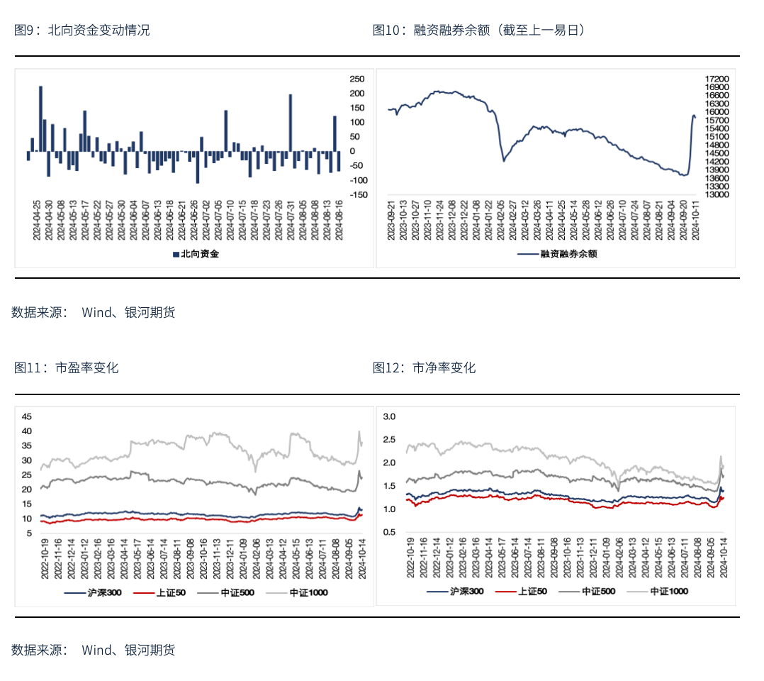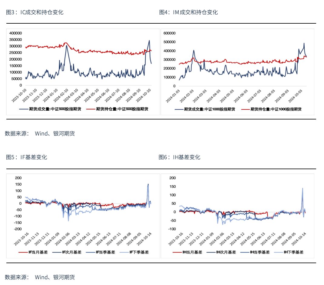 股指期货随现货分化,至收盘,主力成交合约IH2410涨1.6%,IF2410涨2.05%,IC2410涨2.61%,IM2410涨3.92%。各品种基差全线回落,仅IF当月、IH季月合约小幅升水。IC、IF、IH和IM成交分别下降15.1%、13.6%、12.2%和7.3%。IC、IF、IH和IM持仓分别下降1.9%、1.8%、0.1%和3.5%。