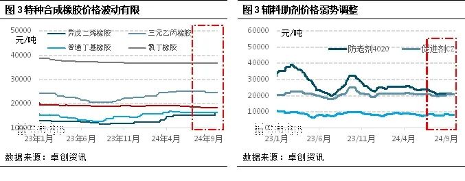 综合来看,三季度天然橡胶、合成橡胶价格的上涨,主要来自天然橡胶、丁二烯供应端偏紧,以及合成橡胶的成本端上涨驱动;而特种合成橡胶、辅料助剂的弱势主要受到需求端疲弱及成本端下跌的制约。