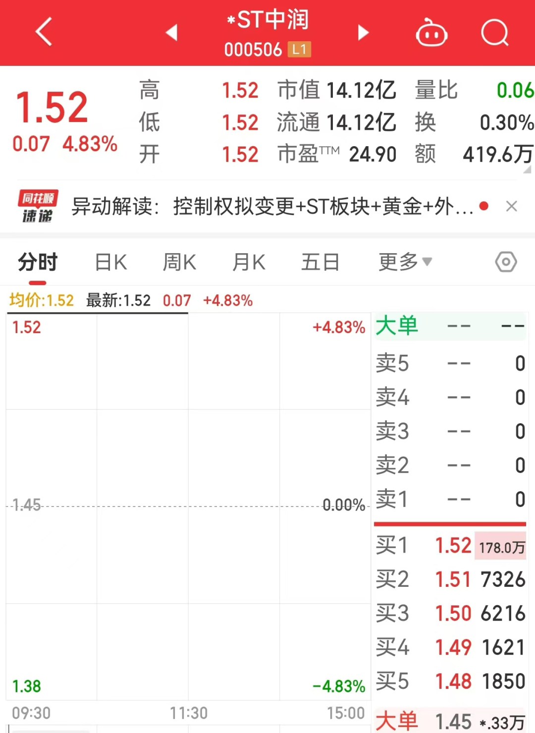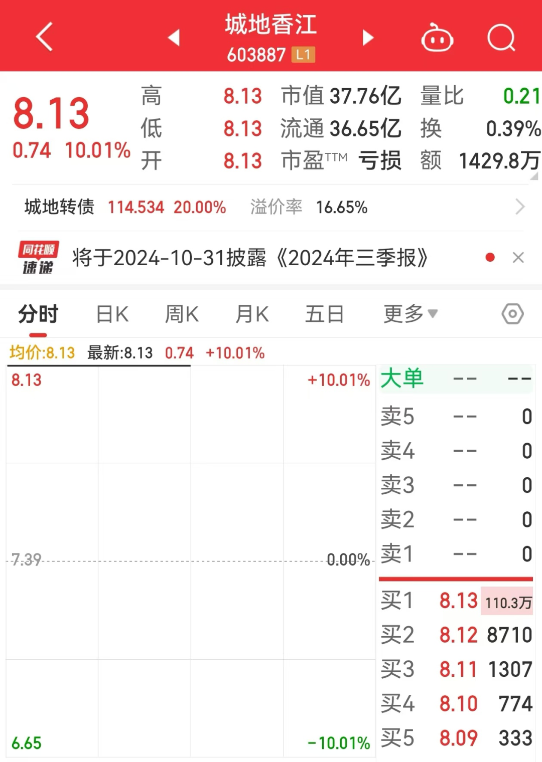 受上述消息影响,城地香江、*ST中润今日复牌,股价双双封涨停板。