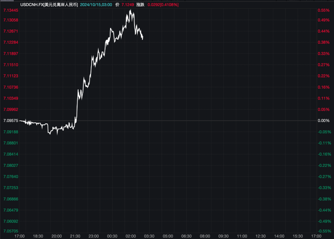 15日午后,人民币对美元汇率出现一波下跌。盘中,在岸、离岸人民币对美元汇率分别跌破7.12元、7.13元,盘中最大跌幅分别超400个基点、300个基点。