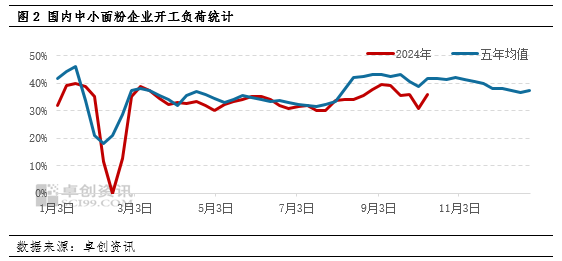 中秋节后面粉企业订单量出现减少,国庆后亦有企业表示面粉现货库存增加,因此部分企业在国庆期间放假,也有部分企业国庆后因面粉库存增长而降低生产量或短时停机。截至10月9日,卓创资讯监测的主产区面粉企业平均开工负荷数据35.96%,低于节前0.08个百分点,低于同期6.75个百分点。