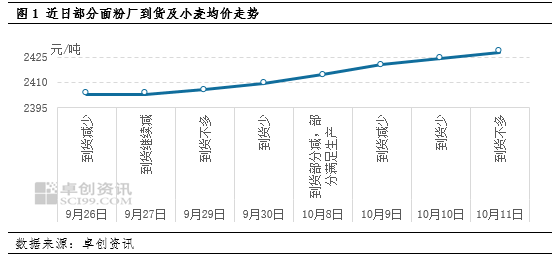 国庆后不少面粉企业表示小麦到货量少,生产消耗小麦库存,而由于部分企业小麦库存自国庆前开始消耗,库存有明显下降,因此近日陆续有企业上调小麦收购价格。从卓创资讯调研的山东地区部分日加工小麦1000吨的面粉企业日到货情况来看,多数厂家的到货量在近日持续偏少,因此主产区小麦均价涨势较国庆前有所增强。截至10月11日,主产区二等小麦均价为2428元/吨,较国庆前涨幅0.77%。