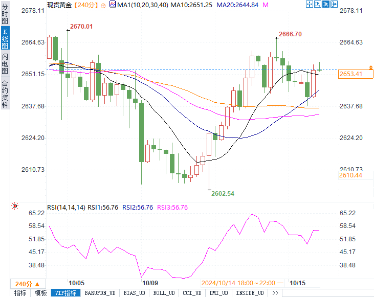 截至北京时间10月15日晚间,国际现货黄金价格仍在2650美元附近徘徊,表现出强大的韧性。日内波动较为平稳,金价最低触及2638美元,最高达到2655美元。尽管受到美元指数走高的压力,黄金未出现明显的下跌。