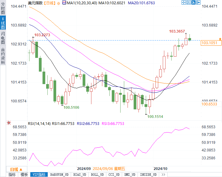 汇通财经APP讯——周二(10月15日 )外汇市场的焦点继续集中在美元的表现上。美元指数在接近两个月高位的区间内运行,当前报103.19,略低于周一触及的103.36的高点。在美联储近期降息步伐有所放缓的背景下,美元延续了强势反弹势头。市场对未来美联储货币政策的预期已经从大幅降息转向温和降息,这使得美元相较于其他货币表现出强劲的韧性。