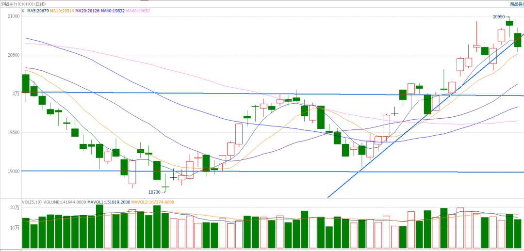 截至前一个交易日收盘,沪铝低开低走,收小阴线。日k线大方向整体呈强势,沿10日均线震荡上行。