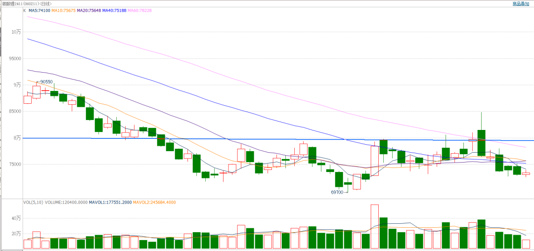 截至前一个交易日收盘,碳酸锂窄幅波动,收小阳线。日k线近期连续底部盘整,79000附近存在较大压力。
