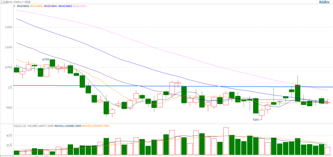 截至前一个交易日收盘,工业硅窄幅波动,冲高回落。日k线近期连续底部盘整,大方向仍为弱势。