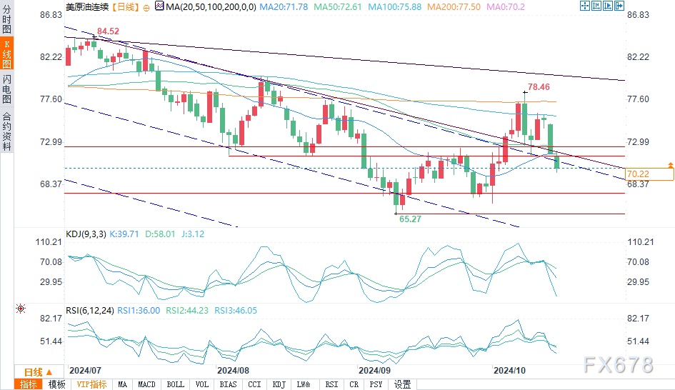 由于技术指标显示油价有进一步下行的潜力,而且欧佩克和国际能源署都预计需求将走弱,原油价格的市场前景堪忧。供应担忧缓解,加上全球需求走弱,表明油价可能会继续下跌,短期内可能会试探每桶66美元至64美元的支撑位。交易者应该关注进一步的下行势头,尤其是在关键支撑位被突破的情况下。