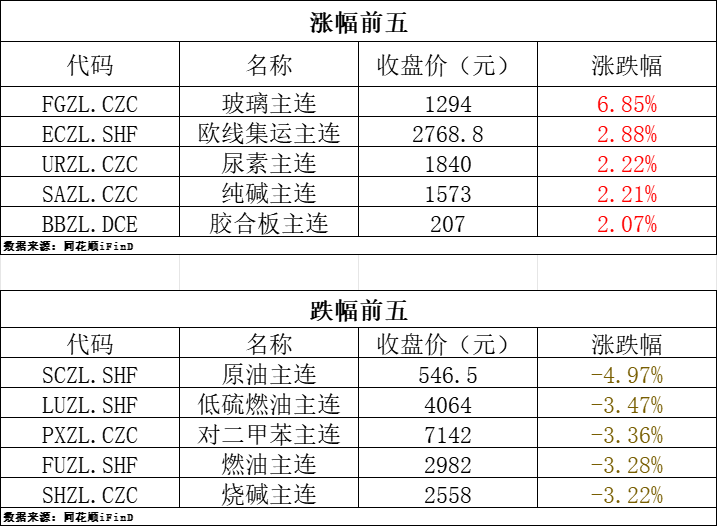 10月15日,国内商品期货多数收跌,原油跌近5%,烧碱、燃料油、对二甲苯跌超3%;玻璃涨超6%,欧线集运、尿素、纯碱涨超2%。