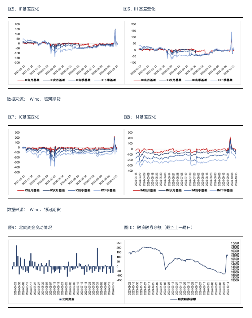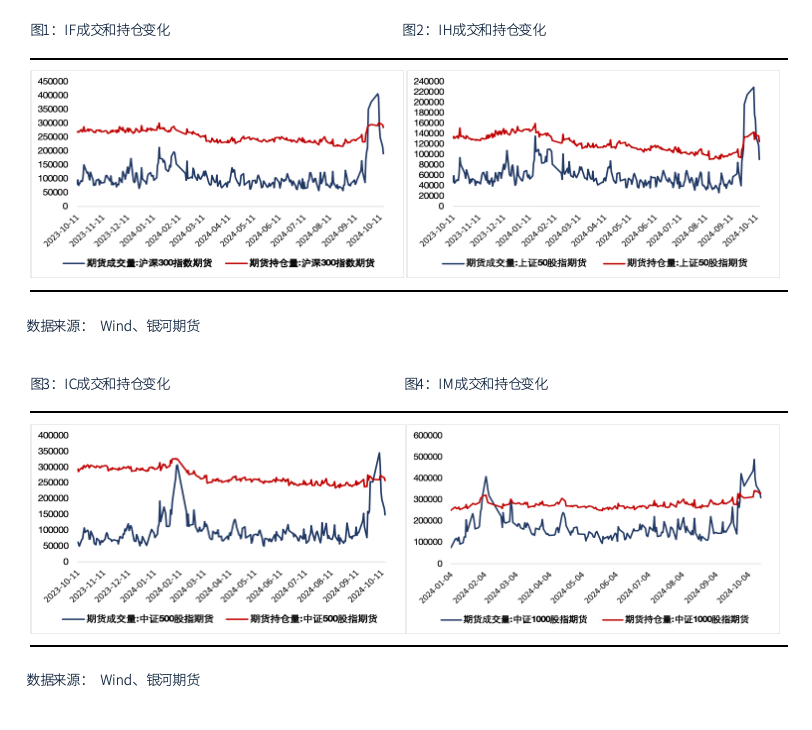 股指期货随现货回落,至收盘,主力成交合约IH2410跌2.32%,IF2410跌2.58%,IC2410跌2.28%,IM2410跌1.96%。各品种基差继续回落,除IH当月合约小幅升水外全线贴水。IC、IF、IH和IM成交分别下降11.4%、11.7%、23%和8.5%。IC、IF、IH和IM持仓分别下降2.8%、2.8%、8.4%和0.1%。