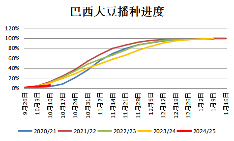 巴西农业部下属的国家气象研究所(INMET)称,近日帕拉纳州、圣卡塔琳娜州、圣保罗州、南马托格罗索州和米纳斯吉拉斯州有强降雨,24小时内累积降雨量或达70~125毫米,有助于农户播种大豆。此前由于土壤过于干燥,农户推迟大豆播种。巴西国家商品供应公司(CONAB)数据显示,截至10月6日,2024/2025年度巴西大豆播种进度为5.1%,一周前2.4%,去年同期为10.1%。经纪商StoneX10月报告仍维持2024/2025年度巴西大豆产量1.65亿吨不变。该咨询公司称,尽管干旱和高温影响了一些地区,但是现在判断当前的气候状况是否会导致作物损失甚至面积减少还为时过早。从历史经验来看,巴西约70%的大豆种植在10月10日至11月25日之间进行,随着雨季来临,后期播种进度有望加快。
