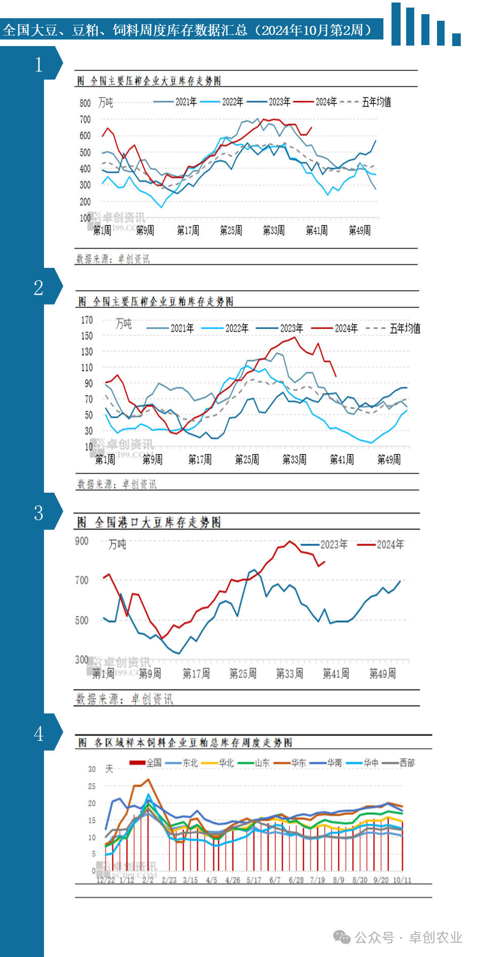 全国大豆、豆粕、饲料库存周度走势图(2024年10月第2周)