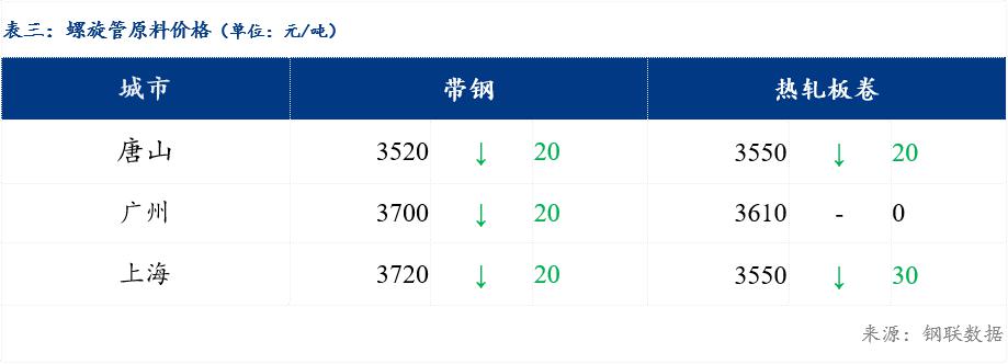 今日全国螺旋管价格稳中有降,多数主流城市螺旋管价格以稳为主。今日钢价下跌为主,黑色系期货全线飘绿,唐山、广州、上海市场带钢、热卷价格小幅下跌20-30元/吨不等,其中广州市场热卷价格暂稳。市场方面,近期原料价格小幅回调,且市场需求表现平平,商家补库意愿不高,多按需采购为主,快进快出操作。管厂多数跟随原料价格小幅下调,出货为主。预计短期内全国螺旋管价格或将震荡盘整运行。