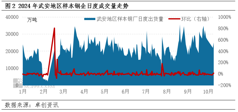 预计10月下半月市场需求量缓慢回升。10月初适逢国庆节放假,市场交投活跃度偏低,对上半月整体成交量造成一定影响,再加上假期后一段时间内期螺盘面震荡下跌,市场乐观情绪降温,下游拿货意愿减弱,成交一般偏弱。卓创资讯数据显示,10月8日至14日,武安地区样本钢厂工业线材日均出货量为2.49万吨(统计窗口期为9:00-16:00,下同),较9月日均出货量下降0.16万吨,降幅6.04%。考虑到10月份仍为拉丝材的传统需求旺季,天气因素对户外施工影响较弱,部分项目进入赶工期,且近期宏观利多举措对市场提振频繁,业者对后续政策的出台、落地仍存较好预期,预计10月下半月需求或重回回升状态。不过近年来下游拿货多保持刚需采购的谨慎模式,当前房地产行业深度调整下刚需或难有亮眼表现,预计10月下半月市场需求缓慢回升,整体仍偏弱。