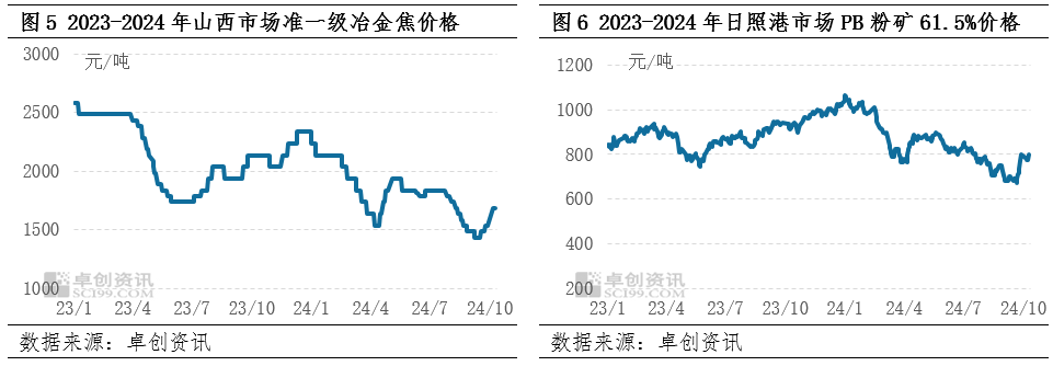 预计10月下半月原料价格重心上移。10月以来铁矿石价格先跌后涨,截至10月14日,日照港市场PB粉矿(61.5%)均价为690-709元/吨,较9月底价格上涨0.5元/吨,原因是宏观预期对期货盘面影响较大,市场情绪对价格影响更为敏感,节后短期内宏观乐观情绪走弱,黑色板块呈现高开低走,铁矿石现货价格有所下调,随着悲观情绪释放后转淡,且铁水产量回升,再加上钢厂矿石库存低,近日钢厂有较强的补库增产需求,需求支撑铁矿石价格再度上涨;焦炭价格则震荡上涨,截至10月14日,山西市场准一级冶金焦成交价为1660-1460元/吨,较9月底价格上涨150元/吨,原因是10月以来钢焦利润良好,焦炭短线供需偏紧,焦炭市场呈现偏强走势,三轮提涨落地。考虑10月下半月需求端对原料价格的支撑尚在,宏观利好一定程度支撑市场情绪,且焦炭第六轮提涨推进中,预计10月下半月原料价格重心上移。