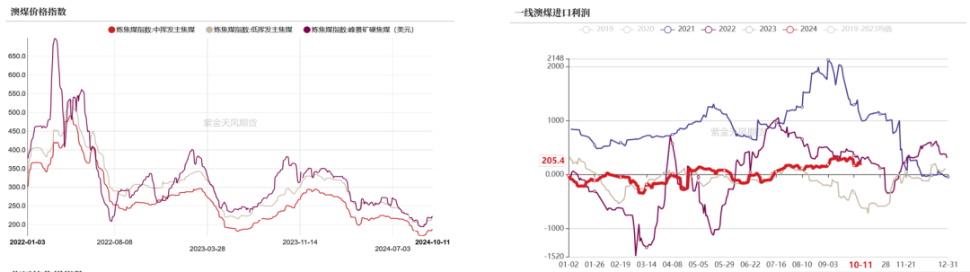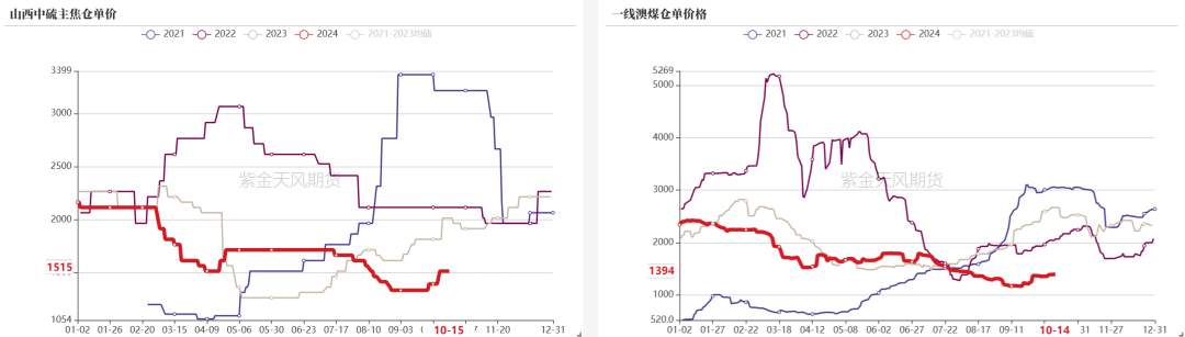 仓单成本:中性焦煤最低仓单澳煤仓单在1400元/吨附近,盘面延续升水。