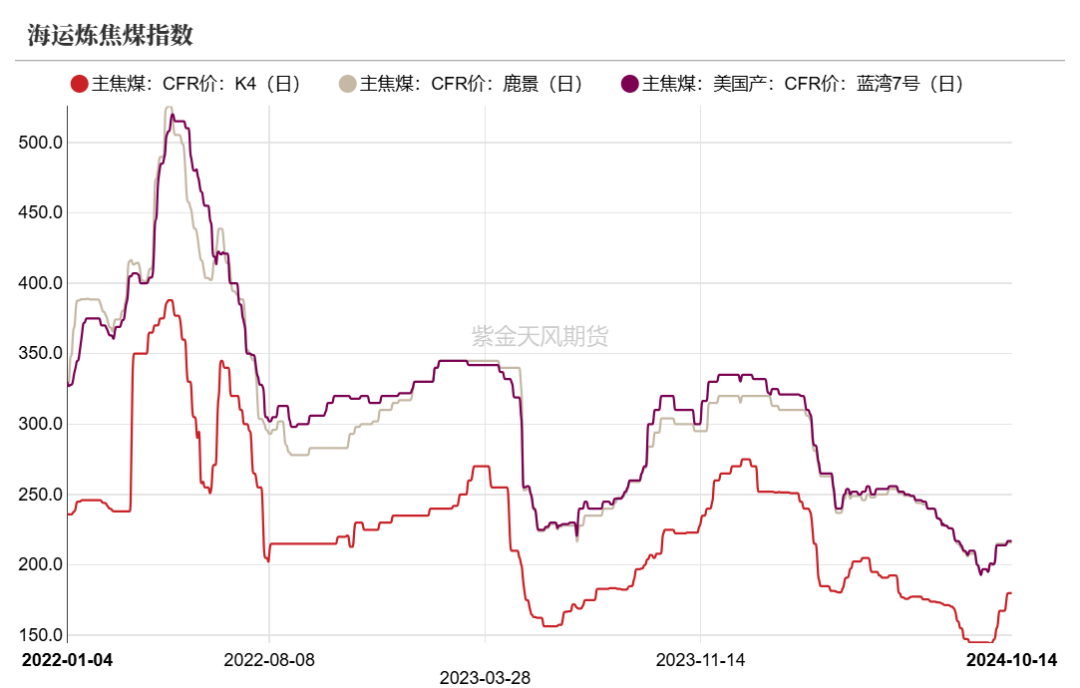 海运煤方面,澳煤远期现货仍然供应充足,实际成交较差,而印度控制澳煤采购,目前澳洲准一线焦煤远期报价继续下跌至FOB194.5美元/吨附近,目前澳煤进口仍有较好的性价比;俄罗斯K4主焦最新CFR报价145美元/吨,周环比持平。