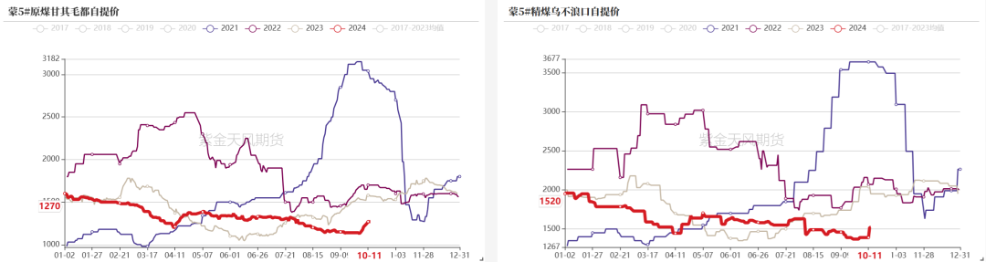 蒙煤成交较前期好转,上周线上竞拍未见流拍,但多数为底价成交,竞价情绪一般;口岸市场成交氛围一般,价格小幅回落,蒙5原煤报价在1250元/吨附近。
