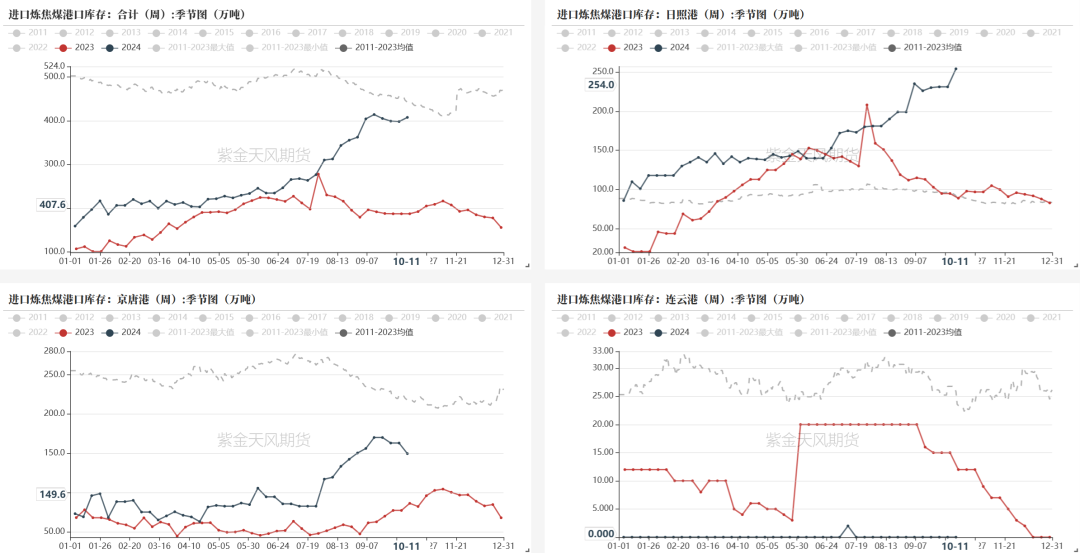 进口炼焦煤港口库存407.6万吨,周环比+9.6万吨;港口库存压力仍大。