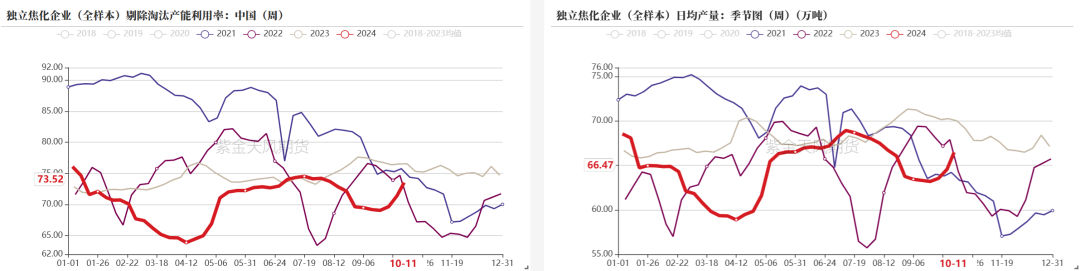 独立焦化企业(全样本)剔除淘汰产能利用率73.52%,周环比+2.11%;