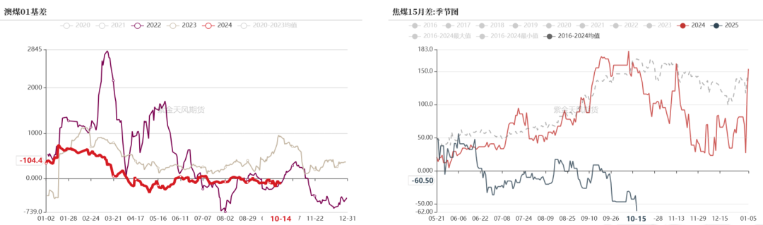 焦煤近期震荡走势,基差小幅走弱,盘面呈现升水;月差方面继续反套格局。