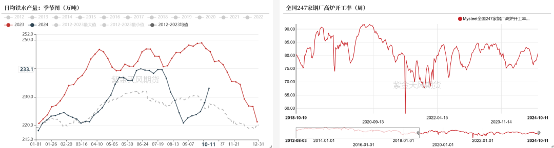 247家钢厂铁水日均产量233.1万吨,周环比+5.1万吨;247家钢厂高炉开工率80.79%,周环比+1.22%;