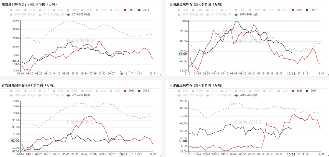 焦炭港口库存184.2万吨,周环比-4万吨。
