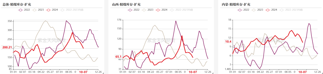 煤矿端,原煤库存周环比-26.29万吨至276.44万吨,精煤库存周环比-20.09万吨至200.21万吨;下游焦化处于涨价周期,煤矿仍有前期订单执行,拉运较好。