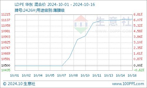 据生意社商品行情分析系统监测,LDPE(2426H)10月1日国内价格在10500元/吨,10月15日均价在11150元/吨,期间报价上涨6.19%。
