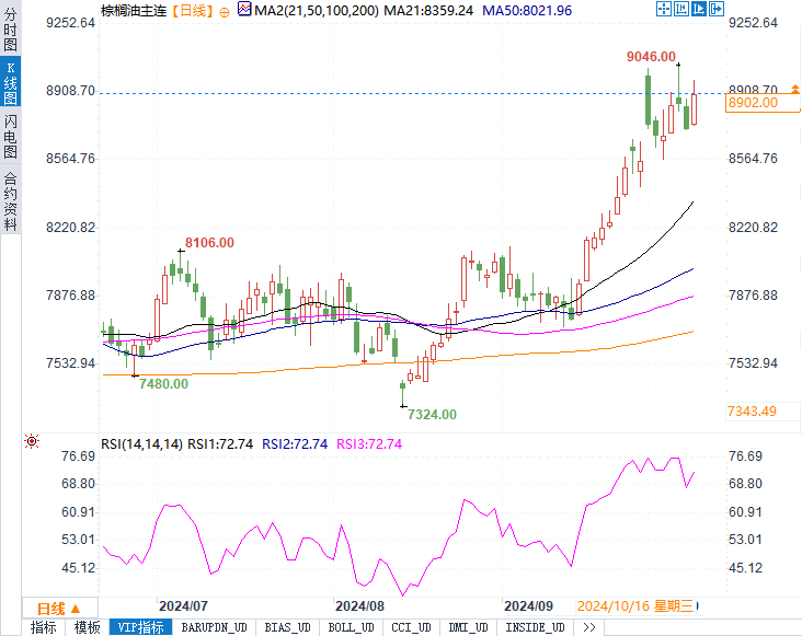 根据《油世界》高级分析师戴维.米尔克(David Mielke)的预测,2024-25年棕榈油产量将比上一季增加230万公吨。这种增长预期为市场注入了信心。同时,船运调查人员估计,10月1日至15日,马来西亚棕榈油产品出口较上月同期增长14%至15.6%。这种强劲的出口表现进一步支撑了价格。